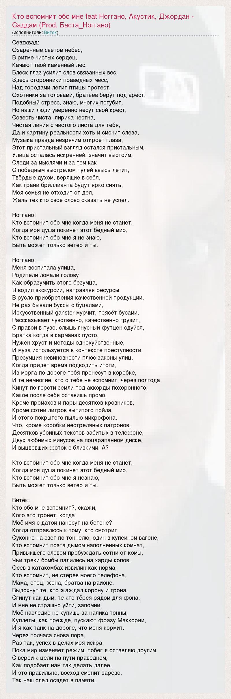 Севzквад: Озарённые светом небес, В ритме чистых сердец, Качают твой каменный лес, Блеск глаз усилит слов связанных вес, Здесь сторонники праведных месс, Над городами летит птицы протест, Охотники за головами, братьев берут под арест, Подобный стресс, знаю, многих погубит, Но наши люди уверенно несут свой крест, Совесть чиста, лирика честна, Чистая линия с чистого листа для тебя, Да и картину реальности хоть и смочит слеза, Музыка правда незрячим откроет глаза, Этот пристальный взгляд остался пристальным, Улица осталась искренней, значит выстоим, Следи за мыслями и за тем как С победным выстрелом пулей ввысь летит, Твёрдые духом, верящие в себя, Как грани бриллианта будут ярко сиять, Моя семья не отходит от дел, Жаль тех кто своё слово сказать не успел. Ноггано: Кто вспомнит обо мне когда меня не станет, Когда моя душа покинет этот бедный мир, Кто вспомнит обо мне я не знаю, Быть может только ветер и ты. Ноггано: Меня воспитала улица, Родители ломали голову Как образумить этого безумца, Я водил экскурсии, направляя ресурсы В русло приобретения качественной продукции, Не раз бывали буксы с буцалами, Искусственный ganster мурчит, трясёт бусами, Рассказывает чувственно, качественно грузит, С правой в пузо, слышь гнусный футцен сдуйся, Братка когда в карманах пусто, Нужен хруст и методы однохуйственные, И муза используется в контексте преступности, Презумция невиновности плюс законы улиц, Когда придёт время подводить итоги, Из морга по дороге тебя пронесут в коробке, И те немногие, кто о тебе не вспомнит, через полгода Кинут по горсти земли под аккорды похоронного, Какое после себя оставишь промо, Кроме промахов и пары десятков кровников, Кроме сотни литров выпитого пойла, И этого покрытого пылью микрофона, Что, кроме коробки нестреляных патронов, Десятков убойных текстов забитых в телефоне, Двух любимых минусов на поцарапанном диске, И выцвевших фоток с близкими. А? Кто вспомнит обо мне когда меня не станет, Когда моя душа покинет этот бедный мир, Кто вспомнит обо мне я незнаю, Быть может только ветер и ты. Витёк: Кто обо мне вспомнит?, скажи, Кого это тронет, когда Моё имя с датой нанесут на бетоне? Когда отправлюсь к тому, кто смотрит Суконно на свет по тоннелю, один в купейном вагоне, Кто вспомнит поэта дымом наполненных комнат, Привыкшего словом пробуждать сотни от комы, Чьи треки бомбы палились на харды копов, Осев в катакомбах извилин как норма, Кто вспомнит, не стерев моего телефона, Мама, отец, жена, братва на районе, Выдохнут те, кто жаждал корону и трона, Сгинут как дым, те кто тёрся рядом для фона, И мне не страшно уйти, запомни, Моё наследие не купишь за налика тонны, Куплеты, как прежде, пускают фразу Маккорни, И я как танк на дороге, что меня кормит. Через полчаса снова пора, Раз так, успех в делах моя искра, Пока мир изменяет режим, побег я оставляю другим, С верой к цели на пути праведном, Как подобает нам так делать далее, И это правильно, восход сменит зарево, Так наш след осядет в памяти.