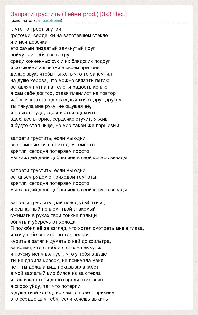 .. что то греет внутри фоточки, сердечки на запотевшем стекле я и моя девочка, это самый пиздатый замкнутый круг поймут ли тебя все вокруг среди конченных сук и их блядских подруг я со своими загонами в своем притоне делаю звук, чтобы ты хоть что то запомнил на душе херова, что можно связать петлю оставляя пятна на теле, я радость коплю я сам себе доктор, ставя плейлист на повтор избегая контор, где каждый хочет друг другом ты тянула мне руку, не ощущая её, я прыгал туда, где хочется сдохнуть вдох, все внорме, сердечко стучит, я жив я будто стал чище, но мир такой же паршивый запрети грустить, если мы одни все поменяется с приходом темноты врятли, сегодня потеряем просто мы каждый день добавляем в свой космос звезды запрети грустить, если мы одни останься рядом с приходом темноты врятли, сегодня потеряем просто мы каждый день добавляем в свой космос звезды запрети грустить, дай повод улыбаться, я осыпанный пеплом, твой знакомый сжимать в руках твои тонкие пальцы обнять и уберечь от холода Я полюбил её за взгляд, что хотел смотреть мне в глаза, я хочу тебе верить, но так нельзя курить в затяг и думать о ней до фильтра, за время, что с тобой я сполна выкупил и почему меня волнует, что у тебя в душе ты не дарила красок, не понимала меня нет, ты делала вид, показывала жест а мой зажатый мир бился из за стекла я так искал тебя долго среди этих спин я скоро уйду, так что потерпи в душе твой холод, но чем то греет, прикинь это сердце для тебя, если хочешь выкинь