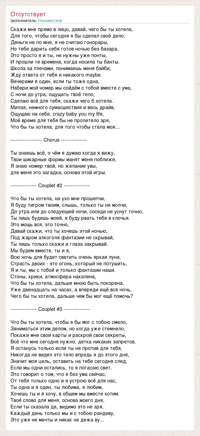 Скажи мне прямо в лицо, давай, чего бы ты хотела, Для того, чтобы сегодня я бы сделал своё дело. Деньги не по мне, я не считаю гонорары, Но тебе дарить себя готов ночью без базара. Это просто я и ты, не нужны уже понты, И прошли те времена, когда носила ты банты. Школа за плечами, понимаешь меня бэйби, Жду ответа от тебя и никакого maybe. Вечерами я один, если ты тоже одна, Набери мой номер мы сойдём с тобой вместе с ума, С ночи до утра, ощущать твоё тело, Сделаю всё для тебя, скажи чего б хотела. Милая, немного сумасшествия и весь драйв, Ощущаю на себе, crazy baby you my life, Моё время для тебя бы не пролетело зря, Что бы ты хотела, для того чтобы стала моя... ------------------ Chorus --------------- Ты знаешь всё, о чём я думаю когда я вижу, Твои шикарные формы манят меня поближе, Я знаю номер твой, но желание увы, для меня это загадка, основа этой игры. --------------- Сouplet #2 --------------- Что бы ты хотела, на ухо мне прошепчи, Я буду тигром твоим, слышь, только ты не молчи, До утра или до следующей ночи, соседи не уснут точно, Ты лишь будешь моей, я буду рвать тебя в клочья. Это мощь вся, это точно, Давай скажи, что ты хочешь этой ночью, Под жаром алкоголя фантазии не скрывай, Ты лишь только скажи и глаза закрывай. Мы будем вместе, ты и я, Всю ночь для будет светить очень яркая луна, Страсть двоих - это огонь, который не потушить, Я и ты, мы с тобой и только фантазии наши. Стоны, крики, атмосфера накалена, Что бы ты хотела, дальше мною быть покорена, Уже двенадцать на часах, а впереди ещё вся ночь, Чего бы ты хотела, дальше чем бы мог ещё помочь? --------------- Сouplet #3 --------------- Что бы ты хотела, чтобы я бы мог с тобою смело, Заниматься этим делом, но когда уже стемнело, Покажи мне свои карты и раскрой свои секреты, Всё что мне сегодня нужно, детка никаких запретов. Я останусь только если ты не против для тебя, Никогда не видел это тело впредь я до этого дня, Значит моя цель, оставить на тебе сегодня след, Если мы одни остались, то я погасаю свет. Это говорит о том, что я без ума сейчас, От тебя только одно и я устрою всё для нас, Ты одна и я один, ты любима, я любим, Хочешь ты и я хочу, в общем мы вместе хотим. Твоё слово для меня, основа моего дня, Если ты сказала да, видимо это не зря, Каждый день только мы и с тобою рандеву, Это уже не мечты и никак не дежа ву...