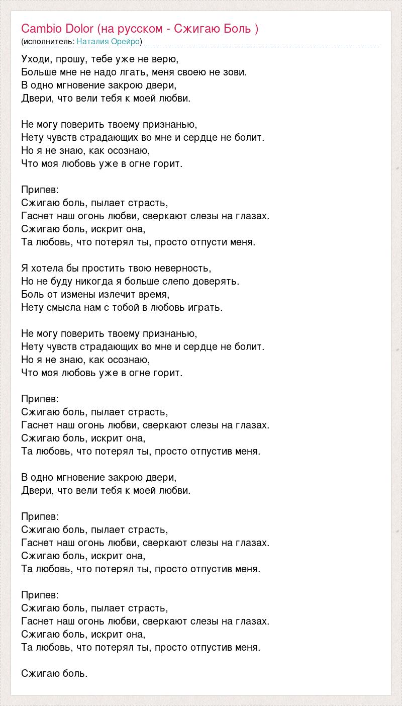 Уходи, прошу, тебе уже не верю, Больше мне не надо лгать, меня своею не зови. В одно мгновение закрою двери, Двери, что вели тебя к моей любви. Не могу поверить твоему признанью, Нету чувств страдающих во мне и сердце не болит. Но я не знаю, как осознаю, Что моя любовь уже в огне горит. Припев: Сжигаю боль, пылает страсть, Гаснет наш огонь любви, сверкают слезы на глазах. Сжигаю боль, искрит она, Та любовь, что потерял ты, просто отпусти меня. Я хотела бы простить твою неверность, Но не буду никогда я больше слепо доверять. Боль от измены излечит время, Нету смысла нам с тобой в любовь играть. Не могу поверить твоему признанью, Нету чувств страдающих во мне и сердце не болит. Но я не знаю, как осознаю, Что моя любовь уже в огне горит. Припев: Сжигаю боль, пылает страсть, Гаснет наш огонь любви, сверкают слезы на глазах. Сжигаю боль, искрит она, Та любовь, что потерял ты, просто отпустив меня. В одно мгновение закрою двери, Двери, что вели тебя к моей любви. Припев: Сжигаю боль, пылает страсть, Гаснет наш огонь любви, сверкают слезы на глазах. Сжигаю боль, искрит она, Та любовь, что потерял ты, просто отпустив меня. Припев: Сжигаю боль, пылает страсть, Гаснет наш огонь любви, сверкают слезы на глазах. Сжигаю боль, искрит она, Та любовь, что потерял ты, просто отпустив меня. Сжигаю боль.
