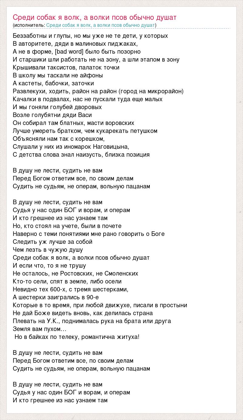 Беззаботны и глупы, но мы уже не те дети, у которых В авторитете, дяди в малиновых пиджаках, А не в форме, [bad word] было быть позорно И старшики шли работать не на зону, а шли этапом в зону Крышивали таксистов, палаток точки В школу мы таскали не айфоны А кастеты, бабочки, заточки Развлекухи, ходить, район на район (город на микрорайон) Качалки в подвалах, нас не пускали туда еще малых И мы гоняли голубей дворовых Возле голубятни дяди Васи Он собирал там блатных, масти воровских Лучше умереть братком, чем кукарекать петушком Объясняли нам так с корешком, Слушали у них из иномарок Наговицына, С детства слова знал наизусть, близка позиция В душу не лести, судить не вам Перед Богом ответим все, по своим делам Судить не судьям, не операм, вольную пацанам В душу не лести, судить не вам Судья у нас один БОГ и ворам, и операм И кто грешнее из нас узнаем там Но, кто стоял на учете, были в почете Наверно с теми понятиями мне рано говорить о Боге Следить уж лучше за собой Чем лезть в чужую душу Среди собак я волк, а волки псов обычно душат И если что, то я не трушу Не осталось, не Ростовских, не Смоленских Кто-то сели, спят в земле, либо осели Невидно тех 600-х, с тремя шестерками, А шестерки заигрались в 90-е Которые в то время, при любой движухе, писали в простыни Не дай Боже видеть вновь, как делилась страна Плевать на У.К., поднималась рука на брата или друга Земля вам пухом… Но в байках по телеку, романтична житуха! В душу не лести, судить не вам Перед Богом ответим все, по своим делам Судить не судьям, не операм, вольную пацанам В душу не лести, судить не вам Судья у нас один БОГ и ворам, и операм И кто грешнее из нас узнаем там
