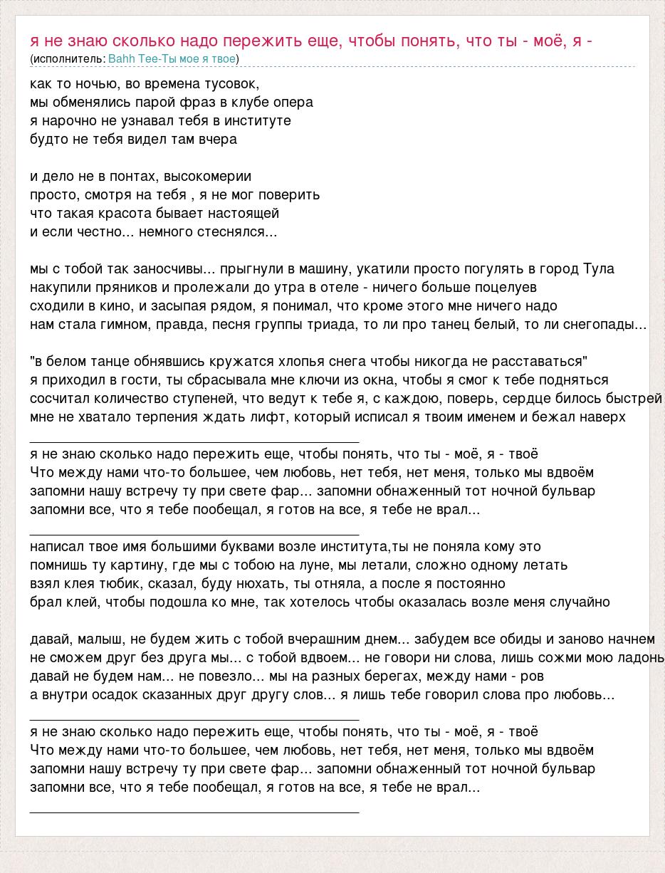 как то ночью, во времена тусовок, мы обменялись парой фраз в клубе опера я нарочно не узнавал тебя в институте будто не тебя видел там вчера и дело не в понтах, высокомерии просто, смотря на тебя , я не мог поверить что такая красота бывает настоящей и если честно... немного стеснялся... мы с тобой так заносчивы... прыгнули в машину, укатили просто погулять в город Тула накупили пряников и пролежали до утра в отеле - ничего больше поцелуев сходили в кино, и засыпая рядом, я понимал, что кроме этого мне ничего надо нам стала гимном, правда, песня группы триада, то ли про танец белый, то ли снегопады... "в белом танце обнявшись кружатся хлопья снега чтобы никогда не расставаться" я приходил в гости, ты сбрасывала мне ключи из окна, чтобы я смог к тебе подняться сосчитал количество ступеней, что ведут к тебе я, с каждою, поверь, сердце билось быстрей мне не хватало терпения ждать лифт, который исписал я твоим именем и бежал наверх __________________________________________ я не знаю сколько надо пережить еще, чтобы понять, что ты - моё, я - твоё Что между нами что-то большее, чем любовь, нет тебя, нет меня, только мы вдвоём запомни нашу встречу ту при свете фар... запомни обнаженный тот ночной бульвар запомни все, что я тебе пообещал, я готов на все, я тебе не врал... __________________________________________ написал твое имя большими буквами возле института,ты не поняла кому это помнишь ту картину, где мы с тобою на луне, мы летали, сложно одному летать взял клея тюбик, сказал, буду нюхать, ты отняла, а после я постоянно брал клей, чтобы подошла ко мне, так хотелось чтобы оказалась возле меня случайно давай, малыш, не будем жить с тобой вчерашним днем... забудем все обиды и заново начнем не сможем друг без друга мы... с тобой вдвоем... не говори ни слова, лишь сожми мою ладонь давай не будем нам... не повезло... мы на разных берегах, между нами - ров а внутри осадок сказанных друг другу слов... я лишь тебе говорил слова про любовь... __________________________________________ я не знаю сколько надо пережить еще, чтобы понять, что ты - моё, я - твоё Что между нами что-то большее, чем любовь, нет тебя, нет меня, только мы вдвоём запомни нашу встречу ту при свете фар... запомни обнаженный тот ночной бульвар запомни все, что я тебе пообещал, я готов на все, я тебе не врал... __________________________________________