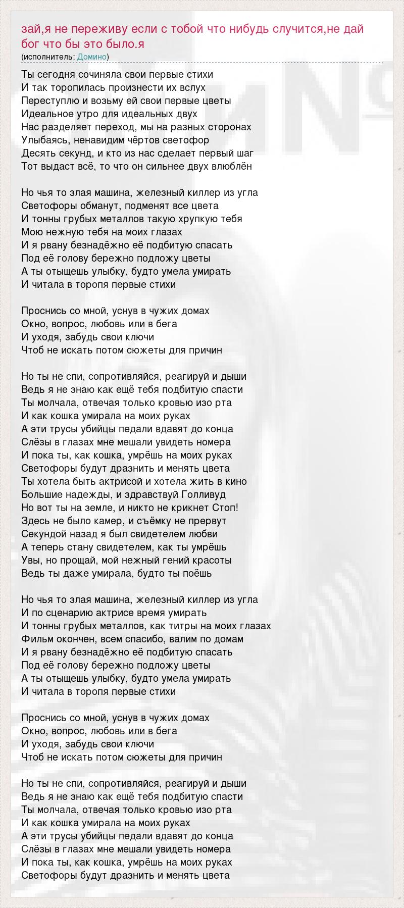 Ты сегодня сочиняла свои первые стихи И так торопилась произнести их вслух Переступлю и возьму ей свои первые цветы Идеальное утро для идеальных двух Нас разделяет переход, мы на разных сторонах Улыбаясь, ненавидим чёртов светофор Десять секунд, и кто из нас сделает первый шаг Тот выдаст всё, то что он сильнее двух влюблён Но чья то злая машина, железный киллер из угла Светофоры обманут, подменят все цвета И тонны грубых металлов такую хрупкую тебя Мою нежную тебя на моих глазах И я рвану безнадёжно её подбитую спасать Под её голову бережно подложу цветы А ты отыщешь улыбку, будто умела умирать И читала в торопя первые стихи Проснись со мной, уснув в чужих домах Окно, вопрос, любовь или в бега И уходя, забудь свои ключи Чтоб не искать потом сюжеты для причин Но ты не спи, сопротивляйся, реагируй и дыши Ведь я не знаю как ещё тебя подбитую спасти Ты молчала, отвечая только кровью изо рта И как кошка умирала на моих руках А эти трусы убийцы педали вдавят до конца Слёзы в глазах мне мешали увидеть номера И пока ты, как кошка, умрёшь на моих руках Светофоры будут дразнить и менять цвета Ты хотела быть актрисой и хотела жить в кино Большие надежды, и здравствуй Голливуд Но вот ты на земле, и никто не крикнет Стоп! Здесь не было камер, и съёмку не прервут Секундой назад я был свидетелем любви А теперь стану свидетелем, как ты умрёшь Увы, но прощай, мой нежный гений красоты Ведь ты даже умирала, будто ты поёшь Но чья то злая машина, железный киллер из угла И по сценарию актрисе время умирать И тонны грубых металлов, как титры на моих глазах Фильм окончен, всем спасибо, валим по домам И я рвану безнадёжно её подбитую спасать Под её голову бережно подложу цветы А ты отыщешь улыбку, будто умела умирать И читала в торопя первые стихи Проснись со мной, уснув в чужих домах Окно, вопрос, любовь или в бега И уходя, забудь свои ключи Чтоб не искать потом сюжеты для причин Но ты не спи, сопротивляйся, реагируй и дыши Ведь я не знаю как ещё тебя подбитую спасти Ты молчала, отвечая только кровью изо рта И как кошка умирала на моих руках А эти трусы убийцы педали вдавят до конца Слёзы в глазах мне мешали увидеть номера И пока ты, как кошка, умрёшь на моих руках Светофоры будут дразнить и менять цвета