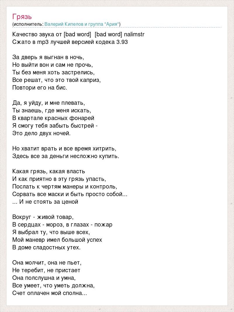 Качество звука от [bad word] [bad word] nalimstr Сжато в mp3 лучшей версией кодека 3.93 За дверь я выгнан в ночь, Но выйти вон и сам не прочь, Ты без меня хоть застрелись, Все решат, что это твой каприз, Повтори его на бис. Да, я уйду, и мне плевать, Ты знаешь, где меня искать, В квартале красных фонарей Я смогу тебя забыть быстрей - Это дело двух ночей. Но хватит врать и все время хитрить, Здесь все за деньги несложно купить. Какая грязь, какая власть И как приятно в эту грязь упасть, Послать к чертям манеры и контроль, Сорвать все маски и быть просто собой... ... И не стоять за ценой Вокруг - живой товар, В сердцах - мороз, в глазах - пожар Я выбрал ту, что выше всех, Мой маневр имел большой успех В доме сладостных утех. Она молчит, она не пьет, Не теребит, не пристает Она полслушна и умна, Все умеет, что уметь должна, Счет оплачен мой сполна...