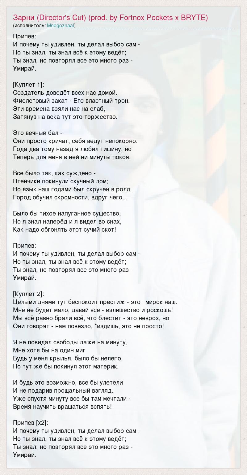 Припев: И почему ты удивлен, ты делал выбор сам - Но ты знал, ты знал всё к этому ведёт; Ты знал, но повторял все это много раз - Умирай. [Куплет 1]: Создатель доведёт всех нас домой. Фиолетовый закат - Его властный трон. Эти времена взяли нас на слаб, Затянув на века тут это торжество. Это вечный бал - Они просто кричат, себя ведут непокорно. Года два тому назад я любил тишину, но Теперь для меня в ней ни минуты покоя. Все было так, как суждено - Птенчики покинули скучный дом; Но язык наш годами был скручен в ролл. Город обучил скромности, вдруг чего... Было бы тихое напуганное существо, Но я знал наперёд и я видел во снах, Как надо обгонять этот сучий скот! Припев: И почему ты удивлен, ты делал выбор сам - Но ты знал, ты знал всё к этому ведёт; Ты знал, но повторял все это много раз - Умирай. [Куплет 2]: Целыми днями тут беспокоит престиж - этот мирок наш. Мне не будет мало, давай все - излишество и роскошь! Мы всё равно брали всё, что блестит - это невроз, но Они говорят - нам повезло, *издишь, это не просто! Я не повидал свободы даже на минуту, Мне хотя бы на один миг Будь у меня крылья, было бы нелепо, Но тут же бы покинул этот материк. И будь это возможно, все бы улетели И не подарив прощальный взгляд. Уже спустя минуту все бы там мечтали - Время научить вращаться вспять! Припев [x2]: И почему ты удивлен, ты делал выбор сам - Но ты знал, ты знал всё к этому ведёт; Ты знал, но повторял все это много раз - Умирай.
