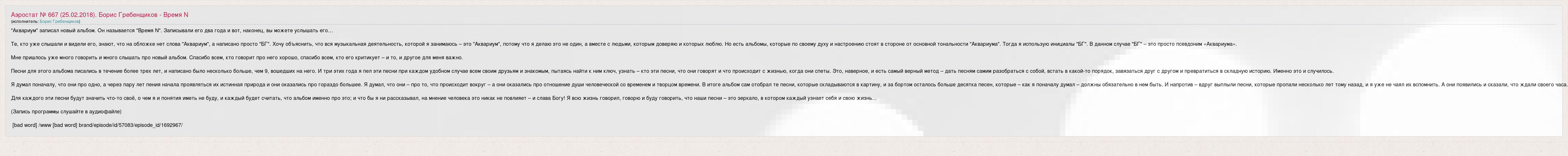 "Аквариум" записал новый альбом. Он называется "Время N". Записывали его два года и вот, наконец, вы можете услышать его… Те, кто уже слышали и видели его, знают, что на обложке нет слова "Аквариум", а написано просто "БГ". Хочу объяснить, что вся музыкальная деятельность, которой я занимаюсь – это "Аквариум", потому что я делаю это не один, а вместе с людьми, которым доверяю и которых люблю. Но есть альбомы, которые по своему духу и настроению стоят в стороне от основной тональности "Аквариума". Тогда я использую инициалы "БГ". В данном случае "БГ" – это просто псевдоним «Аквариума». Мне пришлось уже много говорить и много слышать про новый альбом. Спасибо всем, кто говорит про него хорошо, спасибо всем, кто его критикует – и то, и другое для меня важно. Песни для этого альбома писались в течение более трех лет, и написано было несколько больше, чем 9, вошедших на него. И три этих года я пел эти песни при каждом удобном случае всем своим друзьям и знакомым, пытаясь найти к ним ключ, узнать – кто эти песни, что они говорят и что происходит с жизнью, когда они спеты. Это, наверное, и есть самый верный метод – дать песням самим разобраться с собой, встать в какой-то порядок, завязаться друг с другом и превратиться в складную историю. Именно это и случилось. Я думал поначалу, что они про одно, а через пару лет пения начала проявляться их истинная природа и они оказались про гораздо большее. Я думал, что они – про то, что происходит вокруг – а они оказались про отношение души человеческой со временем и творцом времени. В итоге альбом сам отобрал те песни, которые складываются в картину, и за бортом осталось больше десятка песен, которые – как я поначалу думал – должны обязательно в нем быть. И напротив – вдруг выплыли песни, которые пропали несколько лет тому назад, и я уже не чаял их вспомнить. А они появились и сказали, что ждали своего часа. Для каждого эти песни будут значить что-то своё, о чем я и понятия иметь не буду, и каждый будет считать, что альбом именно про это; и что бы я ни рассказывал, на мнение человека это никак не повлияет – и слава Богу! Я всю жизнь говорил, говорю и буду говорить, что наши песни – это зеркало, в котором каждый узнает себя и свою жизнь... (Запись программы слушайте в аудиофайле) [bad word] /www [bad word] brand/episode/id/57083/episode_id/1692967/