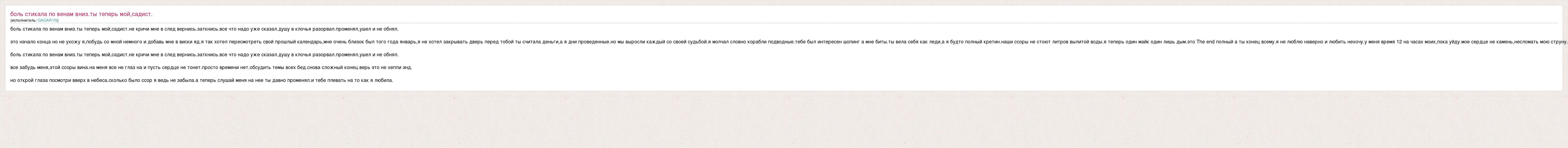 Главная→Исполнители→Неизвестен→боль стикала по венам вниз.ты теперь мой,садист.не кричи мне в след вернись.затк
