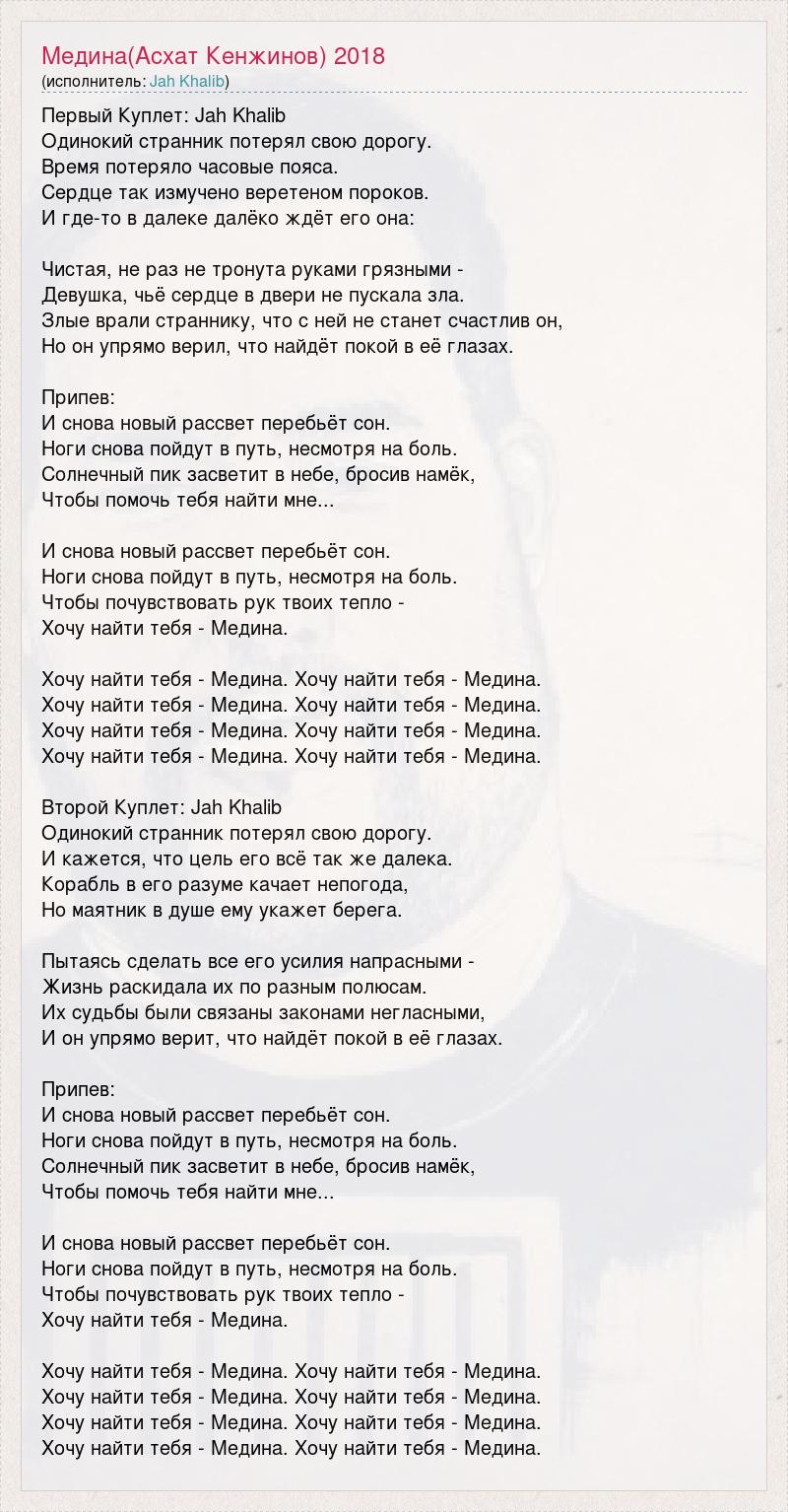 Первый Куплет: Jah Khalib Одинокий странник потерял свою дорогу. Время потеряло часовые пояса. Сердце так измучено веретеном пороков. И где-то в далеке далёко ждёт его она: Чистая, не раз не тронута руками грязными - Девушка, чьё сердце в двери не пускала зла. Злые врали страннику, что с ней не станет счастлив он, Но он упрямо верил, что найдёт покой в её глазах. Припев: И снова новый рассвет перебьёт сон. Ноги снова пойдут в путь, несмотря на боль. Солнечный пик засветит в небе, бросив намёк, Чтобы помочь тебя найти мне... И снова новый рассвет перебьёт сон. Ноги снова пойдут в путь, несмотря на боль. Чтобы почувствовать рук твоих тепло - Хочу найти тебя - Медина. Хочу найти тебя - Медина. Хочу найти тебя - Медина. Хочу найти тебя - Медина. Хочу найти тебя - Медина. Хочу найти тебя - Медина. Хочу найти тебя - Медина. Хочу найти тебя - Медина. Хочу найти тебя - Медина. Второй Куплет: Jah Khalib Одинокий странник потерял свою дорогу. И кажется, что цель его всё так же далека. Корабль в его разуме качает непогода, Но маятник в душе ему укажет берега. Пытаясь сделать все его усилия напрасными - Жизнь раскидала их по разным полюсам. Их судьбы были связаны законами негласными, И он упрямо верит, что найдёт покой в её глазах. Припев: И снова новый рассвет перебьёт сон. Ноги снова пойдут в путь, несмотря на боль. Солнечный пик засветит в небе, бросив намёк, Чтобы помочь тебя найти мне... И снова новый рассвет перебьёт сон. Ноги снова пойдут в путь, несмотря на боль. Чтобы почувствовать рук твоих тепло - Хочу найти тебя - Медина. Хочу найти тебя - Медина. Хочу найти тебя - Медина. Хочу найти тебя - Медина. Хочу найти тебя - Медина. Хочу найти тебя - Медина. Хочу найти тебя - Медина. Хочу найти тебя - Медина. Хочу найти тебя - Медина.