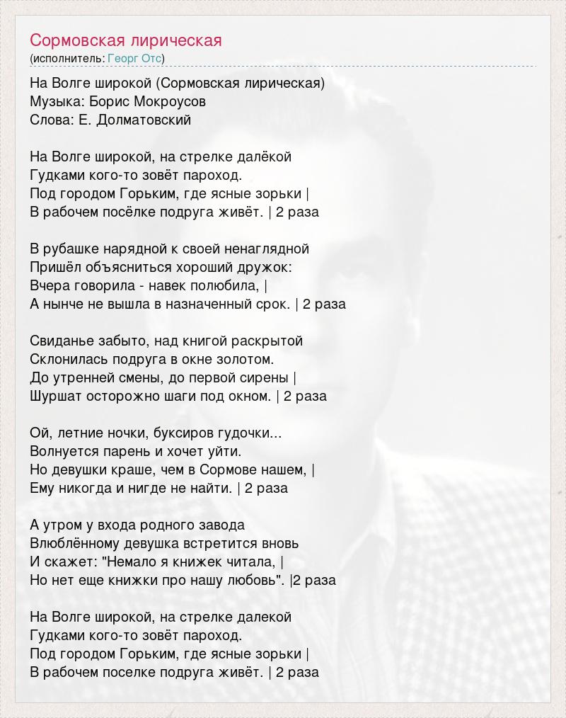 На Волге широкой (Сормовская лирическая) Музыка: Борис Мокроусов Слова: Е. Долматовский На Волге широкой, на cтрелке далёкой Гудками кого-то зовёт пароход. Под городом Горьким, где ясные зорьки | В рабочем посёлке подруга живёт. | 2 раза В рубашке нарядной к своей ненаглядной Пришёл объясниться хороший дружок: Вчера говорила - навек полюбила, | А нынче не вышла в назначенный срок. | 2 раза Свиданье забыто, над книгой раскрытой Склонилась подруга в окне золотом. До утренней смены, до первой сирены | Шуршат осторожно шаги под окном. | 2 раза Ой, летние ночки, буксиров гудочки... Волнуется парень и хочет уйти. Но девушки краше, чем в Сормове нашем, | Ему никогда и нигде не найти. | 2 раза А утром у входа родного завода Влюблённому девушка встретится вновь И скажет: "Немало я книжек читала, | Но нет еще книжки про нашу любовь". |2 раза На Волге широкой, на cтрелке далекой Гудками кого-то зовёт пароход. Под городом Горьким, где ясные зорьки | В рабочем поселке подруга живёт. | 2 раза