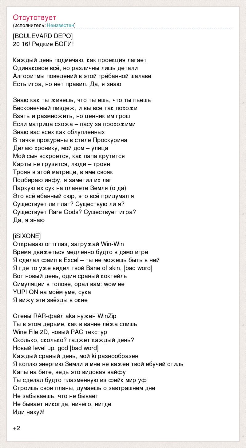 [BOULEVARD DEPO] 20 16! Редкие БОГИ! Каждый день подмечаю, как проекция лагает Одинаковое всё, но различны лишь детали Алгоритмы поведений в этой грёбанной шалаве Есть игра, но нет правил. Да, я знаю Знаю как ты живешь, что ты ешь, что ты пьешь Бесконечный пиздеж, и вы все так похожи Взять и размножить, но ценник им грош Если матрица схожа – пасу за прохожими Знаю вас всех как облупленных В тачке прокурены в стиле Проскурина Делаю хронику, мой дом – улица Мой сын вскроется, как папа крутится Карты не грузятся, люди – троян Троян в этой матрице, в яме свояк Подбираю инфу, я заметил их лаг Паркую их сук на планете Земля (о да) Это всё ебанный сюр, это всё придумал я Существует ли плаг? Существую ли я? Существует Rare Gods? Существует игра? Да, я знаю [iSIXONE] Открываю оптглаз, загружай Win-Win Время движеться медленно будто в дэмо игре Я сделал фаил в Excel – ты не можешь быть в ней Я где то уже видел твой Bane of skin, [bad word] Вот новый день, один сраный коктейль Симуляции в голове, орал вам: wow ee YUPI ON на моём уме, сука Я вижу эти звёзды в окне Стены RAR-файл aka нужен WinZip Ты в этом дерьме, как в ванне лёжа спишь Wine File 2D, новый PAC текстур Сколько, сколько? гаджет каждый день? Новый level up, god [bad word] Каждый сраный день, мой ki разнообразен Я коплю энергию Земли и мне не важен твой ебучий стиль Капы на бите, ведь это видовая вайфу Ты сделал будто плазменную из фейк мир уф Строишь свои планы, думаешь о завтрашнем дне Не забываешь, что не бывает Не бывает никогда, ничего, нигде Иди нахуй! +2