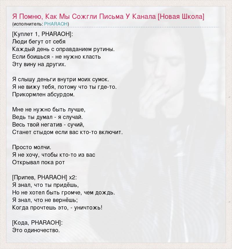 [Куплет 1, PHARAOH]: Люди бегут от себя Каждый день с оправданием рутины. Если боишься - не нужно класть Эту вину на других. Я слышу деньги внутри моих сумок. Я не вижу тебя, потому что ты где-то. Прикормлен абсурдом. Мне не нужно быть лучше, Ведь ты думал - я случай. Весь твой негатив - сучий, Станет стыдом если вас кто-то включит. Просто молчи. Я не хочу, чтобы кто-то из вас Открывал пока рот [Припев, PHARAOH] x2: Я знал, что ты придёшь, Но не хотел быть громче, чем дождь. Я знал, что не вернёшь; Когда прочтешь это, - уничтожь! [Кода, PHARAOH]: Это одиночество.
