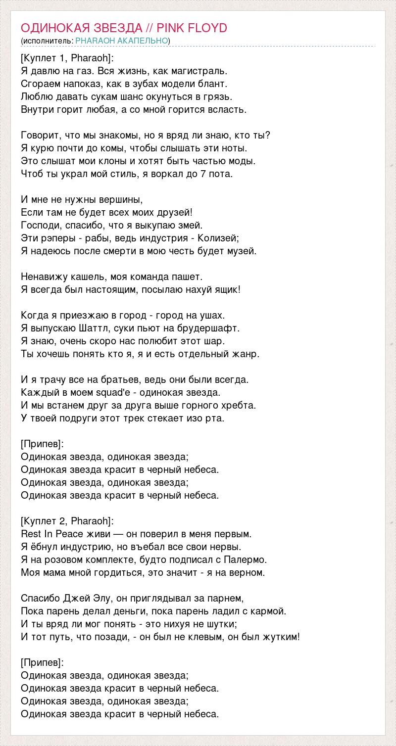 [Куплет 1, Pharaoh]: Я давлю на газ. Вся жизнь, как магистраль. Сгораем напоказ, как в зубах модели блант. Люблю давать сукам шанс окунуться в грязь. Внутри горит любая, а со мной горится всласть. Говорит, что мы знакомы, но я вряд ли знаю, кто ты? Я курю почти до комы, чтобы слышать эти ноты. Это слышат мои клоны и хотят быть частью моды. Чтоб ты украл мой стиль, я воркал до 7 пота. И мне не нужны вершины, Если там не будет всех моих друзей! Господи, спасибо, что я выкупаю змей. Эти рэперы - рабы, ведь индустрия - Колизей; Я надеюсь после смерти в мою честь будет музей. Ненавижу кашель, моя команда пашет. Я всегда был настоящим, посылаю нахуй ящик! Когда я приезжаю в город - город на ушах. Я выпускаю Шаттл, суки пьют на брудершафт. Я знаю, очень скоро нас полюбит этот шар. Ты хочешь понять кто я, я и есть отдельный жанр. И я трачу все на братьев, ведь они были всегда. Каждый в моем squad'е - одинокая звезда. И мы встанем друг за друга выше горного хребта. У твоей подруги этот трек стекает изо рта. [Припев]: Одинокая звезда, одинокая звезда; Одинокая звезда красит в черный небеса. Одинокая звезда, одинокая звезда; Одинокая звезда красит в черный небеса. [Куплет 2, Pharaoh]: Rest In Peace живи — он поверил в меня первым. Я ёбнул индустрию, но въебал все свои нервы. Я на розовом комплекте, будто подписал с Палермо. Моя мама мной гордиться, это значит - я на верном. Спасибо Джей Элу, он приглядывал за парнем, Пока парень делал деньги, пока парень ладил с кармой. И ты вряд ли мог понять - это нихуя не шутки; И тот путь, что позади, - он был не клевым, он был жутким! [Припев]: Одинокая звезда, одинокая звезда; Одинокая звезда красит в черный небеса. Одинокая звезда, одинокая звезда; Одинокая звезда красит в черный небеса.