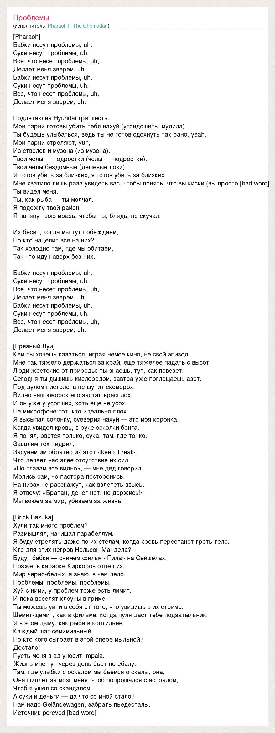 [Pharaoh] Бабки несут проблемы, uh. Суки несут проблемы, uh. Все, что несет проблемы, uh, Делает меня зверем, uh. Бабки несут проблемы, uh. Суки несут проблемы, uh. Все, что несет проблемы, uh, Делает меня зверем, uh. Подлетаю на Hyundai три шесть. Мои парни готовы убить тебя нахуй (угондошить, мудила). Ты будешь улыбаться, ведь ты не готов сдохнуть так рано, yeah. Мои парни стреляют, yuh, Из стволов и музона (из музона). Твои челы — подростки (челы — подростки). Твои челы бездомные (дешевые лохи). Я готов убить за близких, я готов убить за близких. Мне хватило лишь раза увидеть вас, чтобы понять, что вы киски (вы просто [bad word] . Ты видел меня. Ты, как рыба — ты молчал. Я подожгу твой район. Я натяну твою мразь, чтобы ты, блядь, не скучал. Их бесит, когда мы тут побеждаем, Но кто нацелит все на них? Так холодно там, где мы обитаем, Так что иду наверх без них. Бабки несут проблемы, uh. Суки несут проблемы, uh. Все, что несет проблемы, uh, Делает меня зверем, uh. Бабки несут проблемы, uh. Суки несут проблемы, uh. Все, что несет проблемы, uh, Делает меня зверем, uh. [Грязный Луи] Кем ты хочешь казаться, играя немое кино, не свой эпизод. Мне так тяжело держаться за край, еще тяжелее падать с высот. Люди жестокие от природы: ты знаешь, тут, как повезет. Сегодня ты дышишь кислородом, завтра уже поглощаешь азот. Под дулом пистолета не шутит скоморох. Видно наш юморок его застал врасплох, И он уже у усопших, хоть еще не усох. На микрофоне тот, кто идеально плох. Я высыпал солонку, суеверия нахуй — это моя коронка. Когда увидел кровь, в руке осколки бонга. Я понял, рвется только, сука, там, где тонко. Завалим тех пидрил, Засунем им обратно их этот «keep it real». Что делает нас злее отсутствие их сил. «По глазам все видно», — мне дед говорил. Молись сам, но пастора посторонись. На низах не расскажут, как взлететь ввысь. Я отвечу: «Братан, денег нет, но держись!» Мы воюем за мир, убиваем за жизнь. [Brick Bazuka] Хули так много проблем? Размышлял, начищал парабеллум. Я буду стрелять даже по их стелам, когда кровь перестанет греть тело. Кто для этих негров Нельсон Мандела? Будут бабки — снимем фильм «Пила» на Сейшелах. Позже, в караоке Киркоров отпел их. Мир черно-белых, я знаю, в чем дело. Проблемы, проблемы, проблемы, Хуй с ними, у проблем тоже есть лимит. И пока веселят клоуны в гриме, Ты можешь уйти в себя от того, что увидишь в их стриме. Щемит-щемит, как в фильме, когда пуля даст тебе подзатыльник. Я в этом дыму, как рыба в коптильне. Каждый шаг семимильный, Но кто кого сыграет в этой опере мыльной? Достало! Пусть меня в ад уносит Impala. Жизнь мне тут через день бьет по ебалу. Там, где улыбки с оскалом мы бьемся о скалы, она, Она щиплет за мозг меня, чтоб попрощался с астралом, Чтоб я ушел со скандалом, А суки и деньги — да что со мной стало? Нам надо Geländewagen, забрать пьедесталы. Источник perevod [bad word]