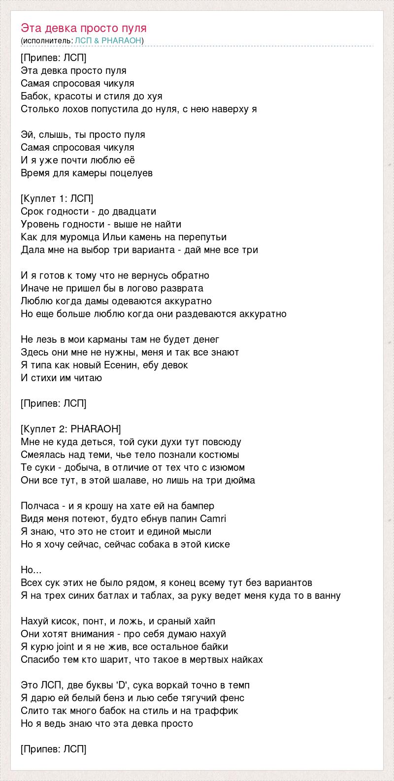 [Припев: ЛСП] Эта девка просто пуля Самая спросовая чикуля Бабок, красоты и стиля до хуя Столько лохов попустила до нуля, с нею наверху я Эй, слышь, ты просто пуля Самая спросовая чикуля И я уже почти люблю её Время для камеры поцелуев [Куплет 1: ЛСП] Срок годности - до двадцати Уровень годности - выше не найти Как для муромца Ильи камень на перепутьи Дала мне на выбор три варианта - дай мне все три И я готов к тому что не вернусь обратно Иначе не пришел бы в логово разврата Люблю когда дамы одеваются аккуратно Но еще больше люблю когда они раздеваются аккуратно Не лезь в мои карманы там не будет денег Здесь они мне не нужны, меня и так все знают Я типа как новый Есенин, ебу девок И стихи им читаю [Припев: ЛСП] [Куплет 2: PHARAOH] Мне не куда деться, той суки духи тут повсюду Смеялась над теми, чье тело познали костюмы Те суки - добыча, в отличие от тех что с изюмом Они все тут, в этой шалаве, но лишь на три дюйма Полчаса - и я крошу на хате ей на бампер Видя меня потеют, будто ебнув папин Camri Я знаю, что это не стоит и единой мысли Но я хочу сейчас, сейчас собака в этой киске Но... Всех сук этих не было рядом, я конец всему тут без вариантов Я на трех синих батлах и таблах, за руку ведет меня куда то в ванну Нахуй кисок, понт, и ложь, и сраный хайп Они хотят внимания - про себя думаю нахуй Я курю joint и я не жив, все остальное байки Спасибо тем кто шарит, что такое в мертвых найках Это ЛСП, две буквы 'D', сука воркай точно в темп Я дарю ей белый бенз и лью себе тягучий фенс Слито так много бабок на стиль и на траффик Но я ведь знаю что эта девка просто [Припев: ЛСП]