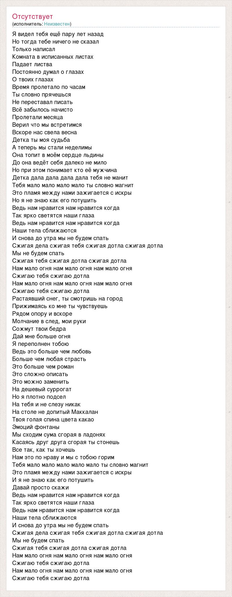 Я видел тебя ещё пару лет назад Но тогда тебе ничего не сказал Только написал Комната в исписанных листах Падает листва Постоянно думал о глазах О твоих глазах Время пролетало по часам Ты словно прячешься Не переставал писать Всё забылось начисто Пролетали месяца Верил что мы встретимся Вскоре нас свела весна Детка ты моя судьба А теперь мы стали неделимы Она топит в моём сердце льдины До она ведёт себя далеко не мило Но при этом понимает кто её мужчина Детка дала дала дала дала тебя не манит Тебя мало мало мало мало ты словно магнит Это пламя между нами зажигается с искры Но я не знаю как его потушить Ведь нам нравится нам нравится когда Так ярко светятся наши глаза Ведь нам нравится нам нравится когда Наши тела сближаются И снова до утра мы не будем спать Сжигая дела сжигая тебя сжигая дотла сжигая дотла Мы не будем спать Сжигая тебя сжигая дотла сжигая дотла Нам мало огня нам мало огня нам мало огня Сжигаю тебя сжигаю дотла Нам мало огня нам мало огня нам мало огня Сжигаю тебя сжигаю дотла Растаявший снег, ты смотришь на город Прижимаясь ко мне ты чувствуешь Рядом опору и вскоре Молчание в след, мои руки Сожмут твои бедра Дай мне больше огня Я переполнен тобою Ведь это больше чем любовь Больше чем любая страсть Это больше чем роман Это сложно описать Это можно заменить На дешевый суррогат Но я плотно подсел На тебя и не слезу никак На столе не допитый Маккалан Твоя голая спина цвета какао Эмоций фонтаны Мы сходим сума сгорая в ладонях Касаясь друг друга сгорая ты стонешь Все так, как ты хочешь Нам это по нраву и мы с тобою горим Тебя мало мало мало мало мало ты словно магнит Это пламя между нами зажигается с искры И я не знаю как его потушить Давай просто скажи Ведь нам нравится нам нравится когда Так ярко светятся наши глаза Ведь нам нравится нам нравится когда Наши тела сближаются И снова до утра мы не будем спать Сжигая дела сжигая тебя сжигая дотла сжигая дотла Мы не будем спать Сжигая тебя сжигая дотла сжигая дотла Нам мало огня нам мало огня нам мало огня Сжигаю тебя сжигаю дотла Нам мало огня нам мало огня нам мало огня Сжигаю тебя сжигаю дотла