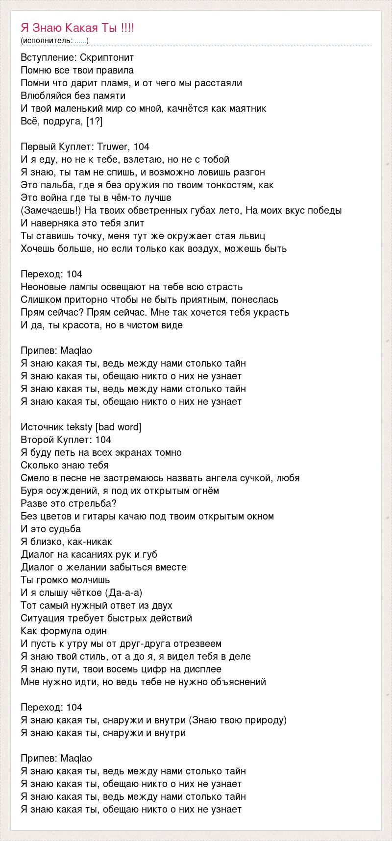 Вступление: Скриптонит Помню все твои правила Помни что дарит пламя, и от чего мы расстаяли Влюбляйся без памяти И твой маленький мир со мной, качнётся как маятник Всё, подруга, [1?] Первый Куплет: Truwer, 104 И я еду, но не к тебе, взлетаю, но не с тобой Я знаю, ты там не спишь, и возможно ловишь разгон Это пальба, где я без оружия по твоим тонкостям, как Это война где ты в чём-то лучше (Замечаешь!) На твоих обветренных губах лето, На моих вкус победы И наверняка это тебя злит Ты ставишь точку, меня тут же окружает стая львиц Хочешь больше, но если только как воздух, можешь быть Переход: 104 Неоновые лампы освещают на тебе всю страсть Слишком приторно чтобы не быть приятным, понеслась Прям сейчас? Прям сейчас. Мне так хочется тебя украсть И да, ты красота, но в чистом виде Припев: Maqlao Я знаю какая ты, ведь между нами столько тайн Я знаю какая ты, обещаю никто о них не узнает Я знаю какая ты, ведь между нами столько тайн Я знаю какая ты, обещаю никто о них не узнает Источник teksty [bad word] Второй Куплет: 104 Я буду петь на всех экранах томно Сколько знаю тебя Смело в песне не застремаюсь назвать ангела сучкой, любя Буря осуждений, я под их открытым огнём Разве это стрельба? Без цветов и гитары качаю под твоим открытым окном И это судьба Я близко, как-никак Диалог на касаниях рук и губ Диалог о желании забыться вместе Ты громко молчишь И я слышу чёткое (Да-а-а) Тот самый нужный ответ из двух Ситуация требует быстрых действий Как формула один И пусть к утру мы от друг-друга отрезвеем Я знаю твой стиль, от а до я, я видел тебя в деле Я знаю пути, твои восемь цифр на дисплее Мне нужно идти, но ведь тебе не нужно объяснений Переход: 104 Я знаю какая ты, снаружи и внутри (Знаю твою природу) Я знаю какая ты, снаружи и внутри Припев: Maqlao Я знаю какая ты, ведь между нами столько тайн Я знаю какая ты, обещаю никто о них не узнает Я знаю какая ты, ведь между нами столько тайн Я знаю какая ты, обещаю никто о них не узнает
