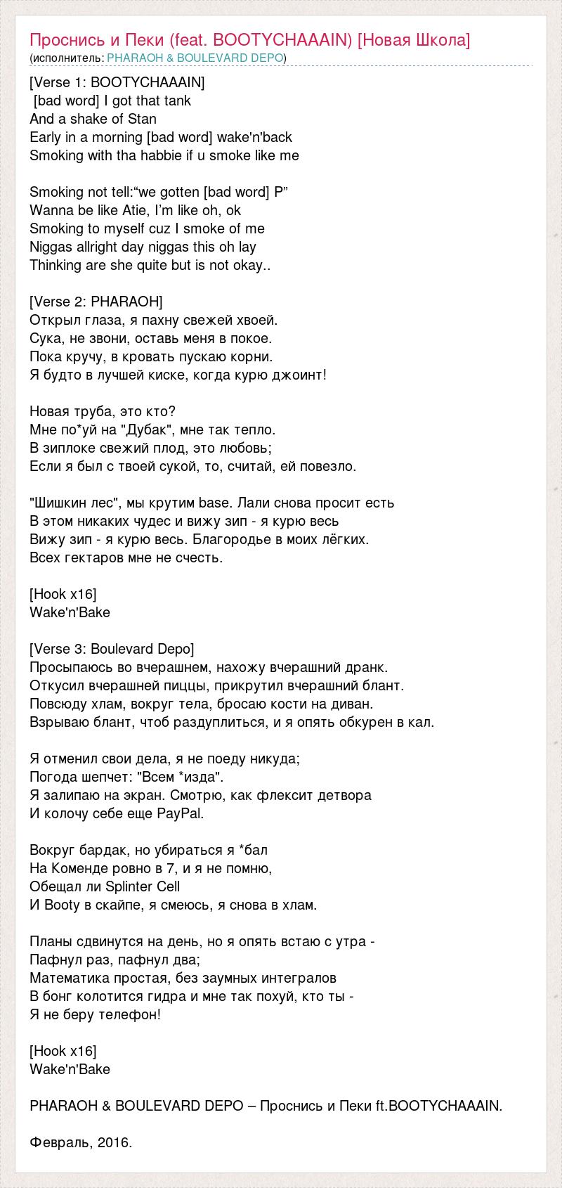 [Verse 1: BOOTYCHAAAIN] [bad word] I got that tank And a shake of Stan Early in a morning [bad word] wake'n'back Smoking with tha habbie if u smoke like me Smoking not tell:“we gotten [bad word] P” Wanna be like Atie, I’m like oh, ok Smoking to myself cuz I smoke of me Niggas allright day niggas this oh lay Thinking are she quite but is not okay.. [Verse 2: PHARAOH] Открыл глаза, я пахну свежей хвоей. Сука, не звони, оставь меня в покое. Пока кручу, в кровать пускаю корни. Я будто в лучшей киске, когда курю джоинт! Новая труба, это кто? Мне по*уй на "Дубак", мне так тепло. В зиплоке свежий плод, это любовь; Если я был с твоей сукой, то, считай, ей повезло. "Шишкин лес", мы крутим base. Лали снова просит есть В этом никаких чудес и вижу зип - я курю весь Вижу зип - я курю весь. Благородье в моих лёгких. Всех гектаров мне не счесть. [Hook x16] Wake'n'Bake [Verse 3: Boulevard Depo] Просыпаюсь во вчерашнем, нахожу вчерашний дранк. Откусил вчерашней пиццы, прикрутил вчерашний блант. Повсюду хлам, вокруг тела, бросаю кости на диван. Взрываю блант, чтоб раздуплиться, и я опять обкурен в кал. Я отменил свои дела, я не поеду никуда; Погода шепчет: "Всем *изда". Я залипаю на экран. Смотрю, как флексит детвора И колочу себе еще PayPal. Вокруг бардак, но убираться я *бал На Коменде ровно в 7, и я не помню, Обещал ли Splinter Cell И Booty в скайпе, я смеюсь, я снова в хлам. Планы сдвинутся на день, но я опять встаю с утра - Пафнул раз, пафнул два; Математика простая, без заумных интегралов В бонг колотится гидра и мне так похуй, кто ты - Я не беру телефон! [Hook x16] Wake'n'Bake PHARAOH & BOULEVARD DEPO – Проснись и Пеки ft.BOOTYCHAAAIN. Февраль, 2016.
