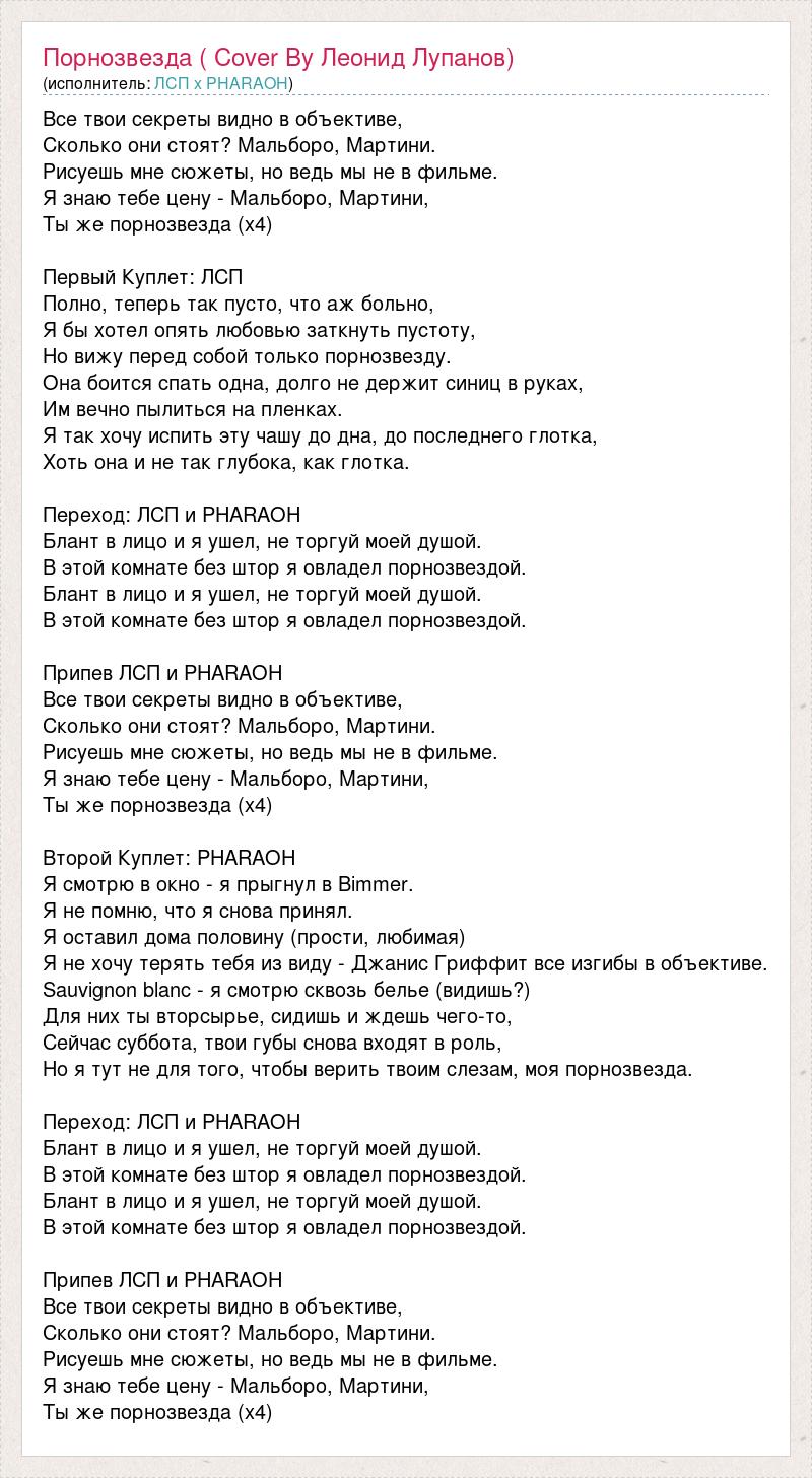 Все твои секреты видно в объективе, Сколько они стоят? Мальборо, Мартини. Рисуешь мне сюжеты, но ведь мы не в фильме. Я знаю тебе цену - Мальборо, Мартини, Ты же порнозвезда (х4) Первый Куплет: ЛСП Полно, теперь так пусто, что аж больно, Я бы хотел опять любовью заткнуть пустоту, Но вижу перед собой только порнозвезду. Она боится спать одна, долго не держит синиц в руках, Им вечно пылиться на пленках. Я так хочу испить эту чашу до дна, до последнего глотка, Хоть она и не так глубока, как глотка. Переход: ЛСП и PHARAOH Блант в лицо и я ушел, не торгуй моей душой. В этой комнате без штор я овладел порнозвездой. Блант в лицо и я ушел, не торгуй моей душой. В этой комнате без штор я овладел порнозвездой. Припев ЛСП и PHARAOH Все твои секреты видно в объективе, Сколько они стоят? Мальборо, Мартини. Рисуешь мне сюжеты, но ведь мы не в фильме. Я знаю тебе цену - Мальборо, Мартини, Ты же порнозвезда (х4) Второй Куплет: PHARAOH Я смотрю в окно - я прыгнул в Bimmer. Я не помню, что я снова принял. Я оставил дома половину (прости, любимая) Я не хочу терять тебя из виду - Джанис Гриффит все изгибы в объективе. Sauvignon blanc - я смотрю сквозь белье (видишь?) Для них ты вторсырье, сидишь и ждешь чего-то, Сейчас суббота, твои губы снова входят в роль, Но я тут не для того, чтобы верить твоим слезам, моя порнозвезда. Переход: ЛСП и PHARAOH Блант в лицо и я ушел, не торгуй моей душой. В этой комнате без штор я овладел порнозвездой. Блант в лицо и я ушел, не торгуй моей душой. В этой комнате без штор я овладел порнозвездой. Припев ЛСП и PHARAOH Все твои секреты видно в объективе, Сколько они стоят? Мальборо, Мартини. Рисуешь мне сюжеты, но ведь мы не в фильме. Я знаю тебе цену - Мальборо, Мартини, Ты же порнозвезда (х4)