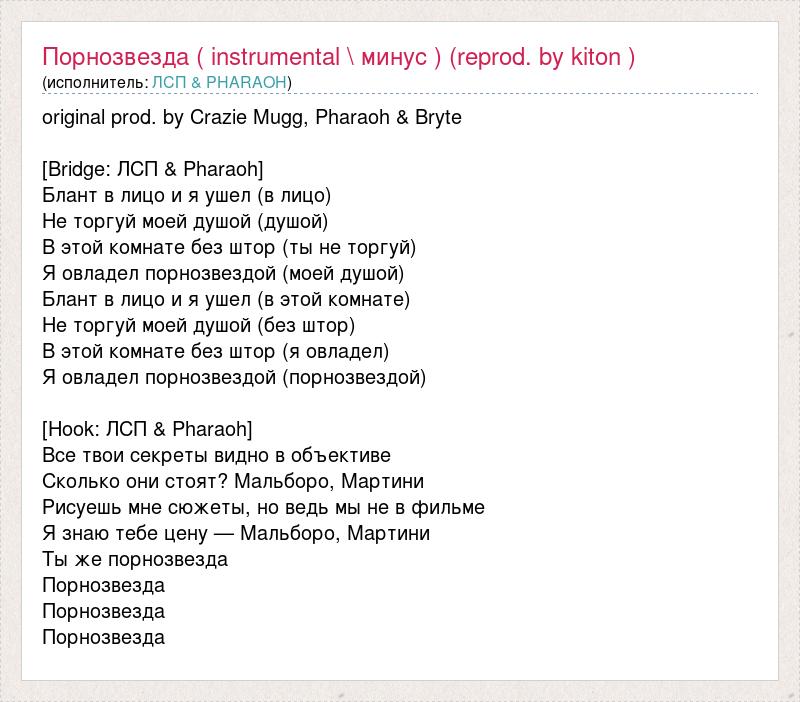original prod. by Crazie Mugg, Pharaoh & Bryte [Bridge: ЛСП & Pharaoh] Блант в лицо и я ушел (в лицо) Не торгуй моей душой (душой) В этой комнате без штор (ты не торгуй) Я овладел порнозвездой (моей душой) Блант в лицо и я ушел (в этой комнате) Не торгуй моей душой (без штор) В этой комнате без штор (я овладел) Я овладел порнозвездой (порнозвездой) [Hook: ЛСП & Pharaoh] Все твои секреты видно в объективе Сколько они стоят? Мальборо, Мартини Рисуешь мне сюжеты, но ведь мы не в фильме Я знаю тебе цену — Мальборо, Мартини Ты же порнозвезда Порнозвезда Порнозвезда Порнозвезда