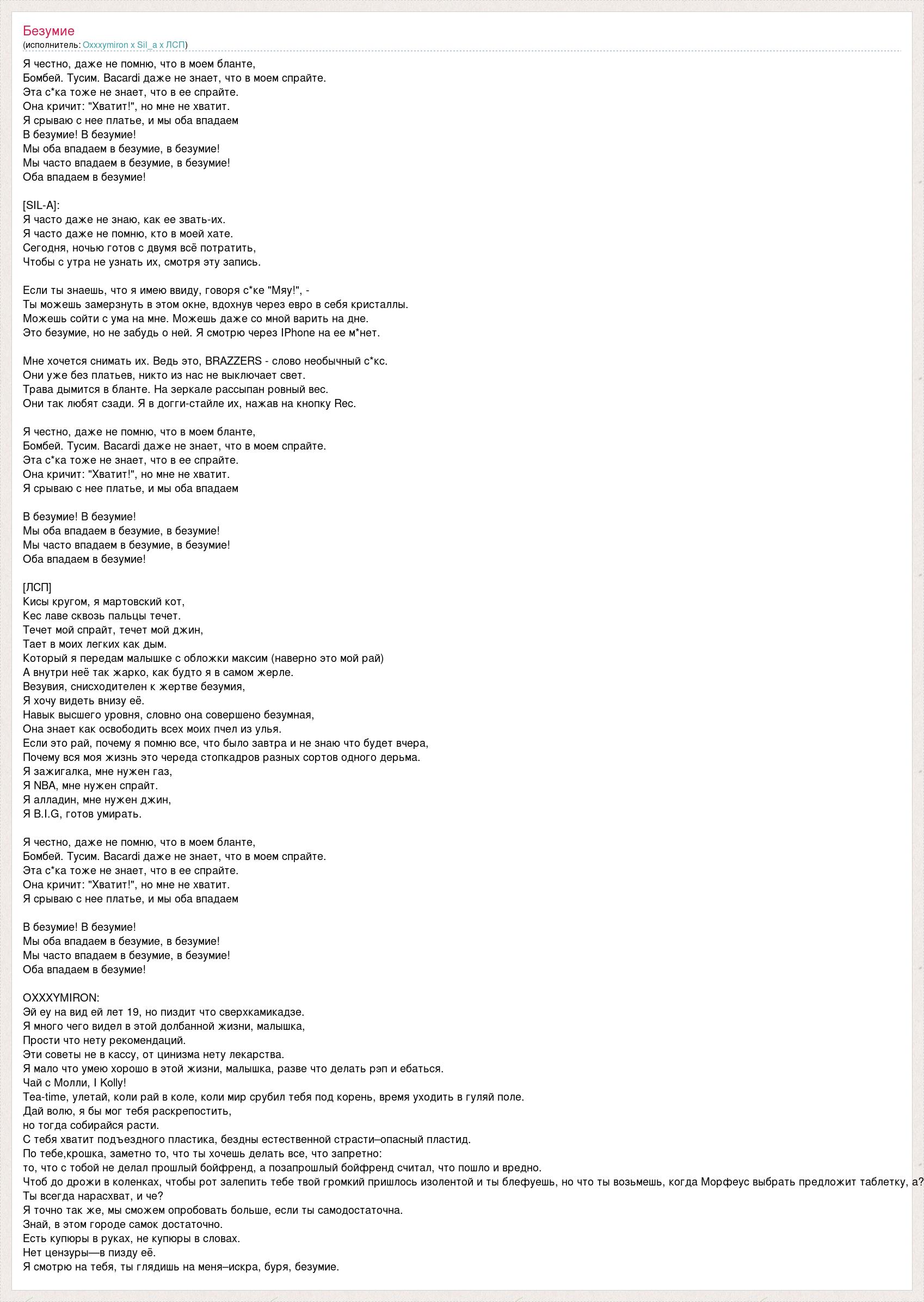 Я честно, даже не помню, что в моем бланте, Бомбей. Тусим. Bacardi даже не знает, что в моем спрайте. Эта с*ка тоже не знает, что в ее спрайте. Она кричит: "Хватит!", но мне не хватит. Я срываю с нее платье, и мы оба впадаем В безумие! В безумие! Мы оба впадаем в безумие, в безумие! Мы часто впадаем в безумие, в безумие! Оба впадаем в безумие! [SIL-A]: Я часто даже не знаю, как ее звать-их. Я часто даже не помню, кто в моей хате. Сегодня, ночью готов с двумя всё потратить, Чтобы с утра не узнать их, смотря эту запись. Если ты знаешь, что я имею ввиду, говоря с*ке "Мяу!", - Ты можешь замерзнуть в этом окне, вдохнув через евро в себя кристаллы. Можешь сойти с ума на мне. Можешь даже со мной варить на дне. Это безумие, но не забудь о ней. Я смотрю через IPhone на ее м*нет. Мне хочется снимать их. Ведь это, BRAZZERS - слово необычный с*кс. Они уже без платьев, никто из нас не выключает свет. Трава дымится в бланте. На зеркале рассыпан ровный вес. Они так любят сзади. Я в догги-стайле их, нажав на кнопку Rec. Я честно, даже не помню, что в моем бланте, Бомбей. Тусим. Bacardi даже не знает, что в моем спрайте. Эта с*ка тоже не знает, что в ее спрайте. Она кричит: "Хватит!", но мне не хватит. Я срываю с нее платье, и мы оба впадаем В безумие! В безумие! Мы оба впадаем в безумие, в безумие! Мы часто впадаем в безумие, в безумие! Оба впадаем в безумие! [ЛСП] Кисы кругом, я мартовский кот, Кес лаве сквозь пальцы течет. Течет мой спрайт, течет мой джин, Тает в моих легких как дым. Который я передам малышке с обложки максим (наверно это мой рай) А внутри неё так жарко, как будто я в самом жерле. Везувия, снисходителен к жертве безумия, Я хочу видеть внизу её. Навык высшего уровня, словно она совершено безумная, Она знает как освободить всех моих пчел из улья. Если это рай, почему я помню все, что было завтра и не знаю что будет вчера, Почему вся моя жизнь это череда стопкадров разных сортов одного дерьма. Я зажигалка, мне нужен газ, Я NBA, мне нужен спрайт. Я алладин, мне нужен джин, Я B.I.G, готов умирать. Я честно, даже не помню, что в моем бланте, Бомбей. Тусим. Bacardi даже не знает, что в моем спрайте. Эта с*ка тоже не знает, что в ее спрайте. Она кричит: "Хватит!", но мне не хватит. Я срываю с нее платье, и мы оба впадаем В безумие! В безумие! Мы оба впадаем в безумие, в безумие! Мы часто впадаем в безумие, в безумие! Оба впадаем в безумие! OXXXYMIRON: Эй еу на вид ей лет 19, но пиздит что сверхкамикадзе. Я много чего видел в этой долбанной жизни, малышка, Прости что нету рекомендаций. Эти советы не в кассу, от цинизма нету лекарства. Я мало что умею хорошо в этой жизни, малышка, разве что делать рэп и ебаться. Чай с Молли, I Kolly! Tea-time, улетай, коли рай в коле, коли мир срубил тебя под корень, время уходить в гуляй поле. Дай волю, я бы мог тебя раскрепостить, но тогда собирайся расти. С тебя хватит подъездного пластика, бездны естественной страсти–опасный пластид. По тебе,крошка, заметно то, что ты хочешь делать все, что запретно: то, что с тобой не делал прошлый бойфренд, а позапрошлый бойфренд считал, что пошло и вредно. Чтоб до дрожи в коленках, чтобы рот залепить тебе твой громкий пришлось изолентой и ты блефуешь, но что ты возьмешь, когда Морфеус выбрать предложит таблетку, а? Ты всегда нарасхват, и че? Я точно так же, мы сможем опробовать больше, если ты самодостаточна. Знай, в этом городе самок достаточно. Есть купюры в руках, не купюры в словах. Нет цензуры—в пизду её. Я 