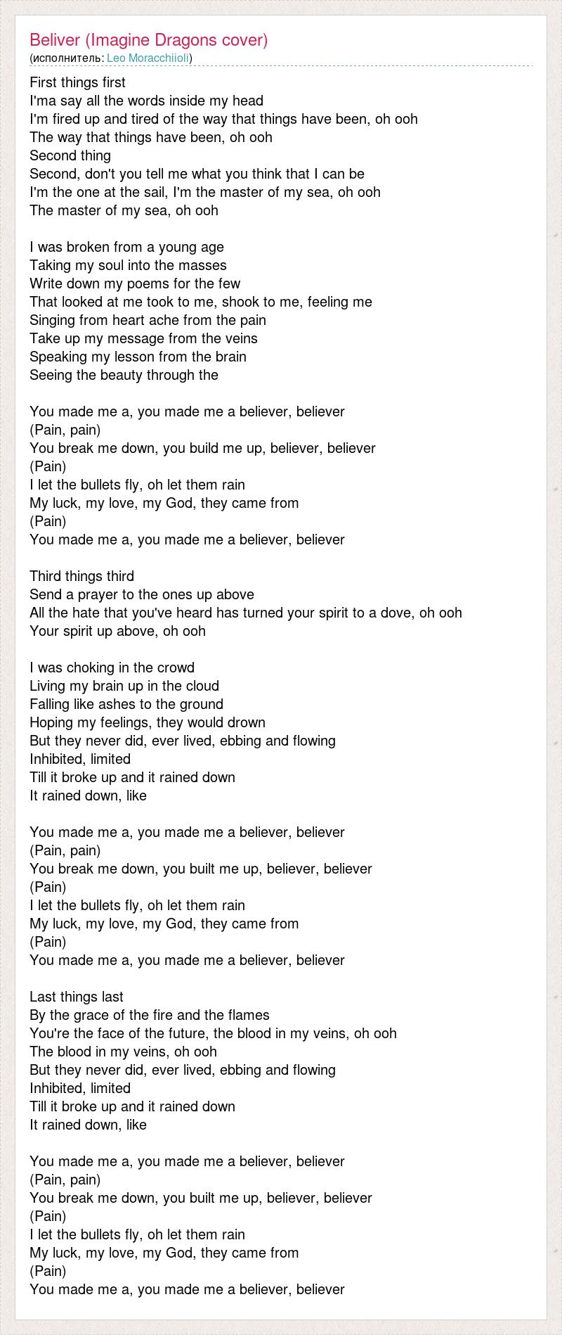 First things first I'ma say all the words inside my head I'm fired up and tired of the way that things have been, oh ooh The way that things have been, oh ooh Second thing Second, don't you tell me what you think that I can be I'm the one at the sail, I'm the master of my sea, oh ooh The master of my sea, oh ooh I was broken from a young age Taking my soul into the masses Write down my poems for the few That looked at me took to me, shook to me, feeling me Singing from heart ache from the pain Take up my message from the veins Speaking my lesson from the brain Seeing the beauty through the You made me a, you made me a believer, believer (Pain, pain) You break me down, you build me up, believer, believer (Pain) I let the bullets fly, oh let them rain My luck, my love, my God, they came from (Pain) You made me a, you made me a believer, believer Third things third Send a prayer to the ones up above All the hate that you've heard has turned your spirit to a dove, oh ooh Your spirit up above, oh ooh I was choking in the crowd Living my brain up in the cloud Falling like ashes to the ground Hoping my feelings, they would drown But they never did, ever lived, ebbing and flowing Inhibited, limited Till it broke up and it rained down It rained down, like You made me a, you made me a believer, believer (Pain, pain) You break me down, you built me up, believer, believer (Pain) I let the bullets fly, oh let them rain My luck, my love, my God, they came from (Pain) You made me a, you made me a believer, believer Last things last By the grace of the fire and the flames You're the face of the future, the blood in my veins, oh ooh The blood in my veins, oh ooh But they never did, ever lived, ebbing and flowing Inhibited, limited Till it broke up and it rained down It rained down, like You made me a, you made me a believer, believer (Pain, pain) You break me down, you built me up, believer, believer (Pain) I let the bullets fly, oh let them rain My luck, my love, my God, they came from (Pain) You made me a, you made me a believer, believer