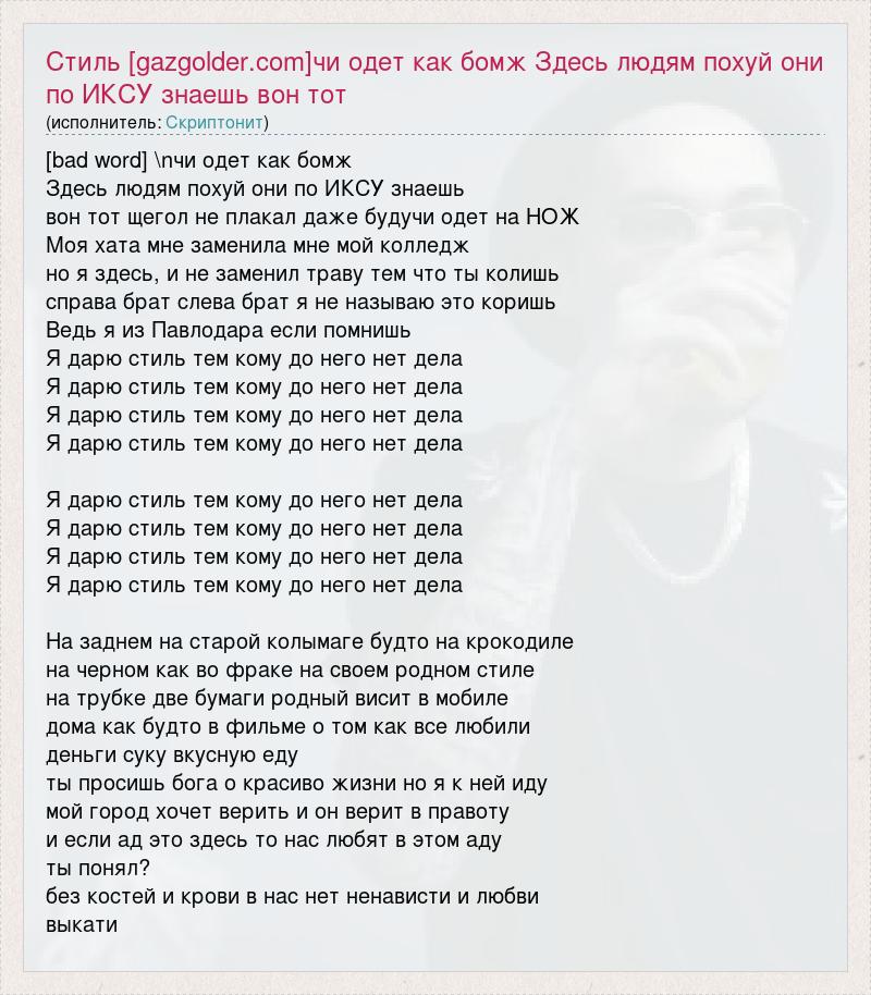 Главная→Исполнители→Скриптонит→Стиль [gazgolder.com]чи одет как бомж Здесь людям похуй они по ИКСУ знаешь во
